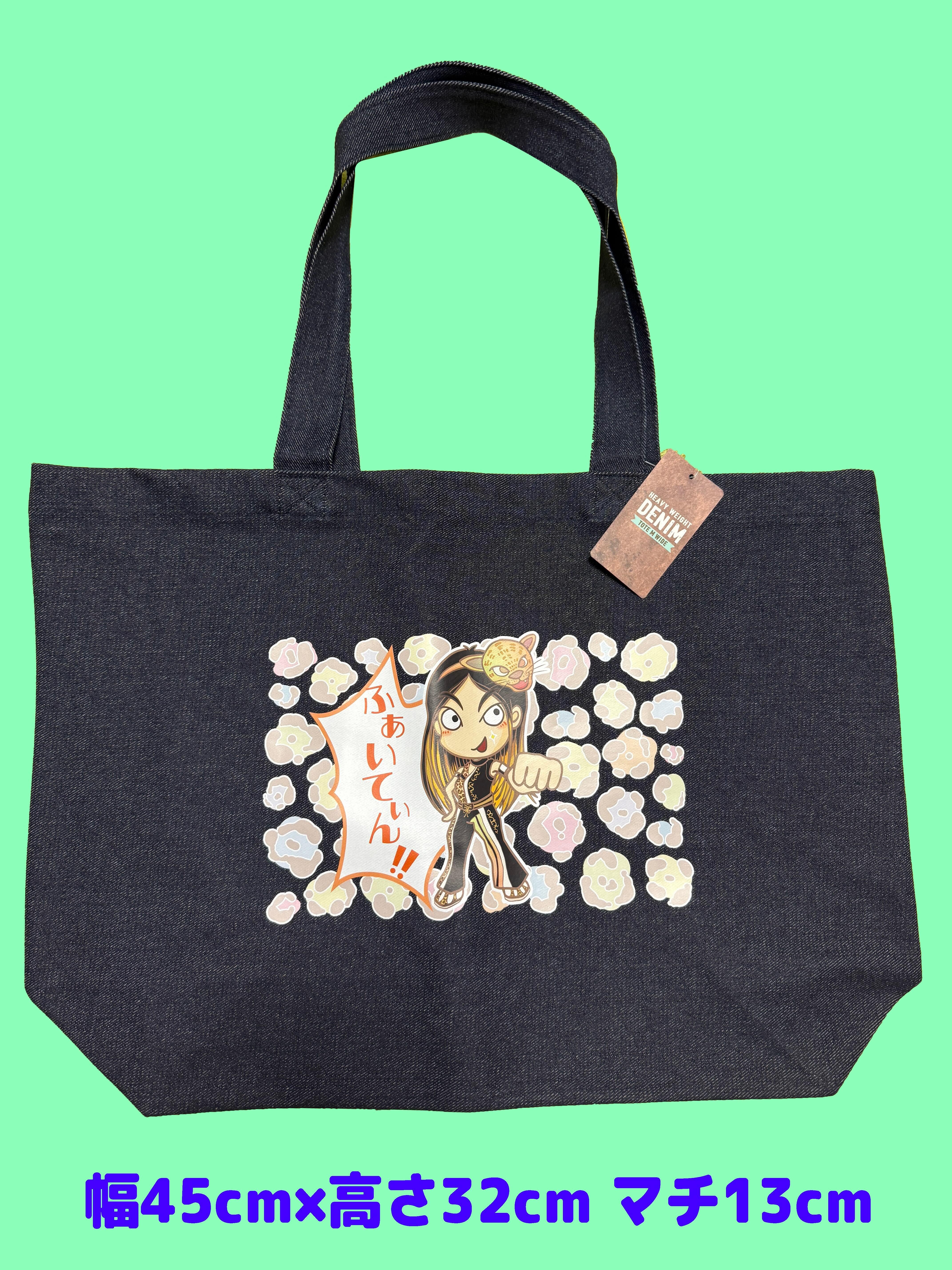 「ジャガーさん家」のイラストが入ったデニムバッグ。